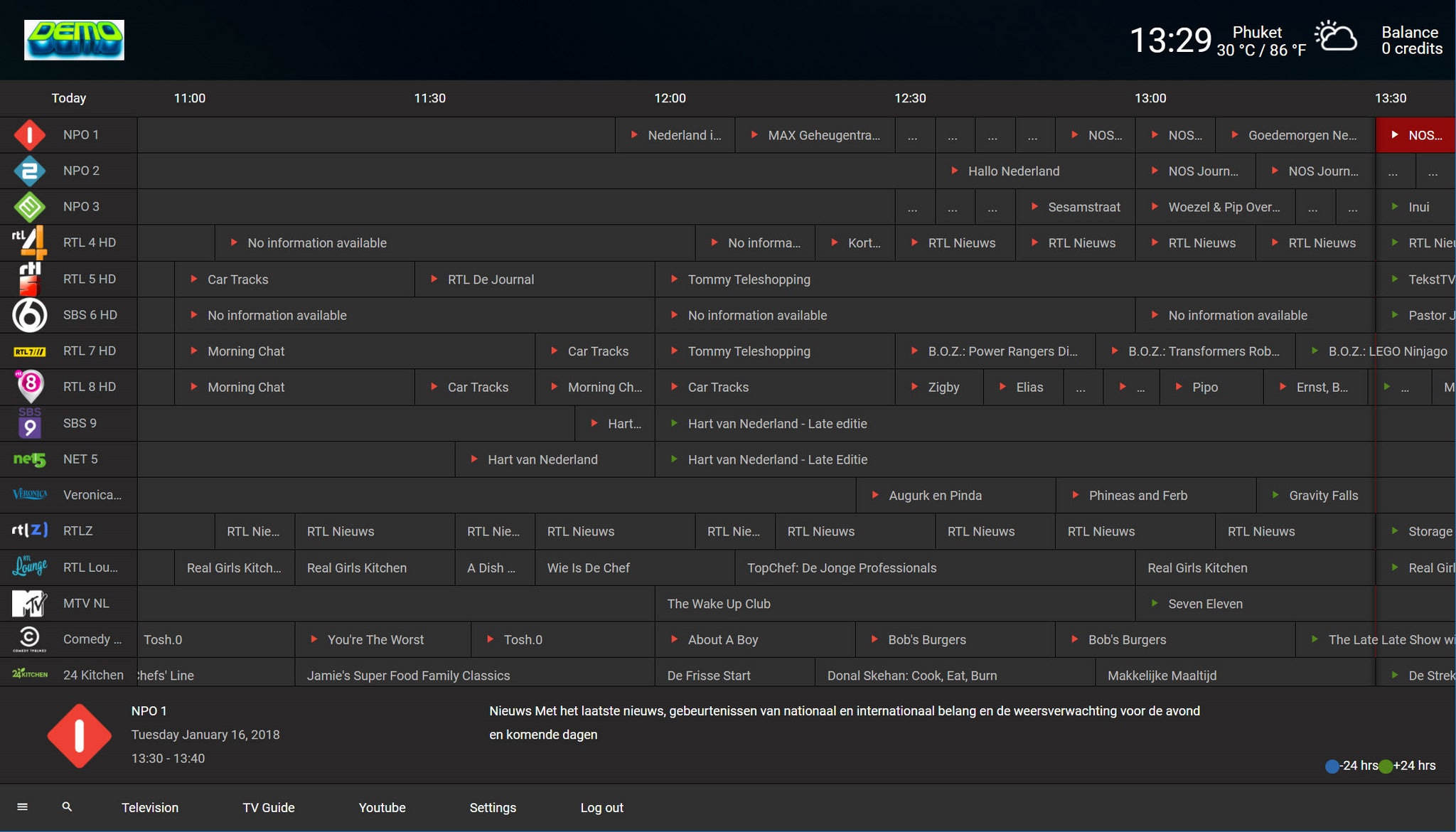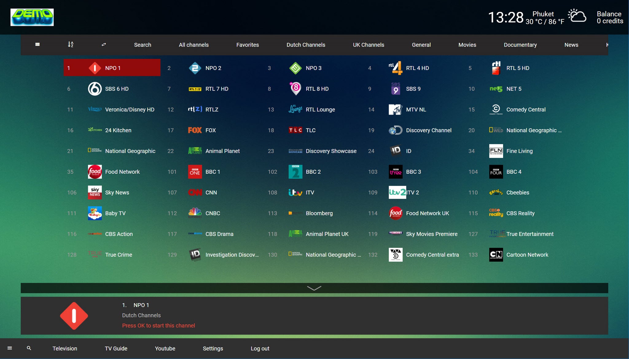 BBC 1, BBC 2, ITV 1, ITV 2, ITV 3, ITV 4, Channel 4, CBS Action, CBS Drama, CBS Reality, Film 4, Spike, BBC News, Sky News, National Geogrophic, Discovery,Syfy